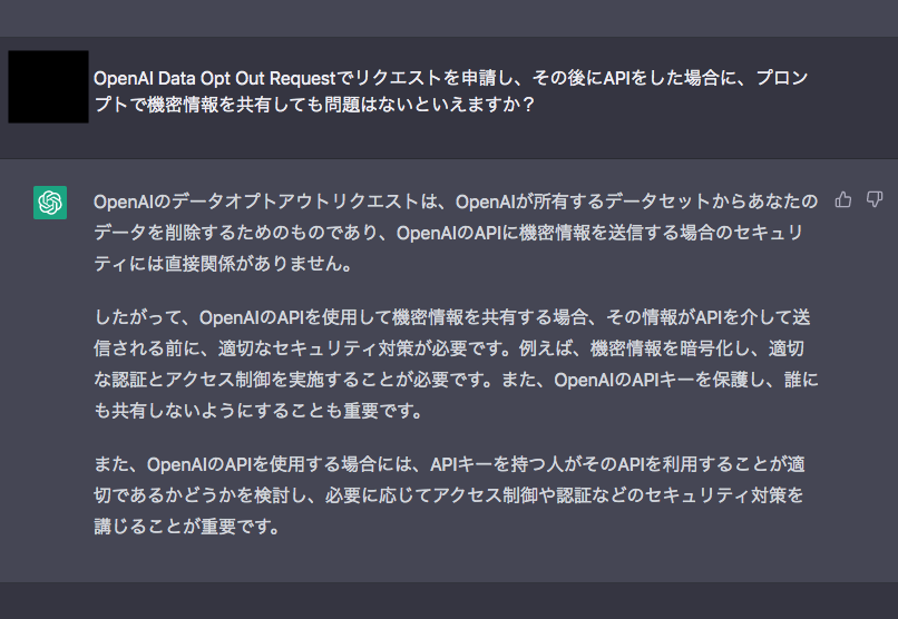 質問し得られた結果が上記となる。この情報を共有します。また、この回答からChatGPTのような生成AIを用いたサービスを利用する際と変わらず「機密性の高い情報は共有しない」ことが推奨される。あと個人的に気になったのは、リスクを軽減するための措置として挙げられている、データの安全性、コンテンツモデレーション、ユーザー教育である。